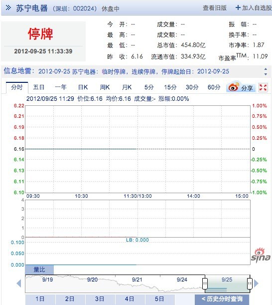 9月25日动静,深交所今日通知布告称,公共传媒呈现关于苏宁电器股份有限公司的信息,可能对公司股票生意价钱发生较年夜影响,苏宁电于自2012年9月25日开市起姑且停牌,待公司刊登相关通知布告后复牌。