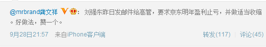 电商业内助士龚文祥透露:“刘强东昨日发邮件给高管,要求京东明年盈利止亏,并做恰当缩短。”