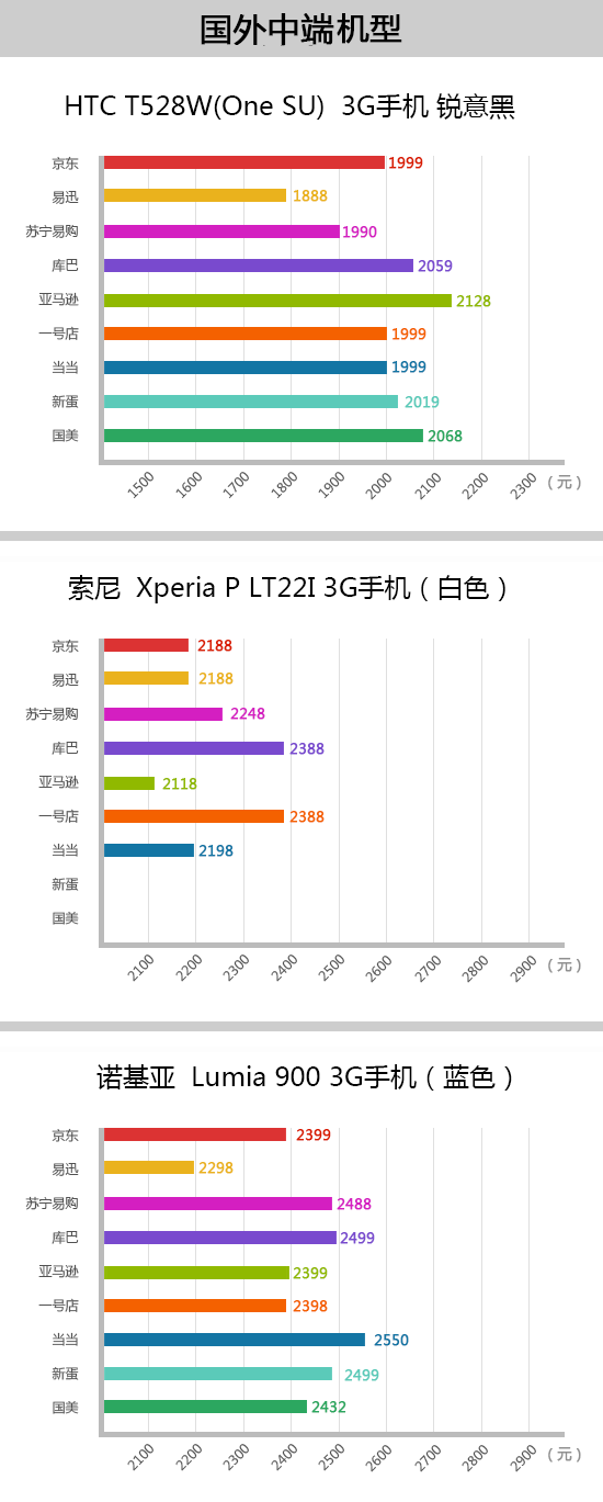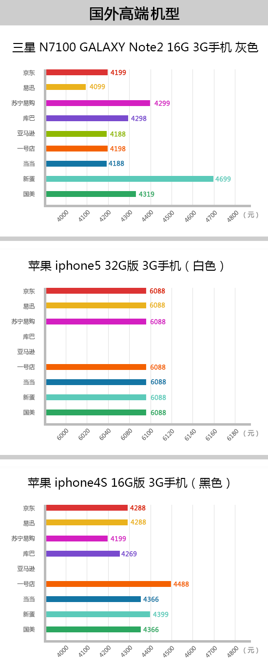 双十二当天,高端热点机型“黑色款iPhone4S 16G”的最低价呈此刻苏宁易购,为4199元,但仍高于双十一促销价4189元。在易讯商城,该款手机12月1日价钱为4199元,12月3日上升至4388元,双十二降至4299元,同样高于双十一促销价4199元。