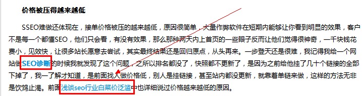 上图中箭头所指的浅谈seo行业白菜价泛滥这就是正文中呈现的联系关系文章内链。