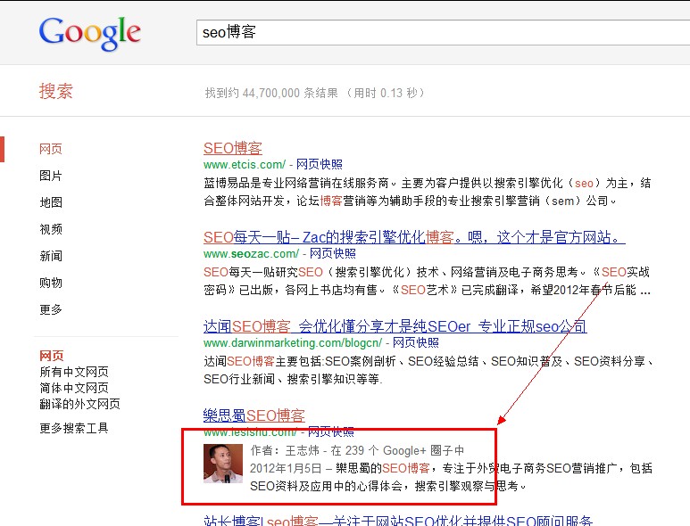 相较于国内的搜索引擎情形,国外会加倍的注重文章内容的版权问题。我们可以看到在Google推出Google+后再其SERP中就呈现了作者信息的注释。作者的注释信息可以包含有作者的头像和签名。我们可以发现Google的这一转变不仅可以很好的呵护作者的版权,更主要的是这点跟上文笔者提到的注释一样可以很好的吸引搜索者的点击。