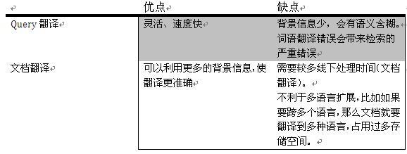文档翻译——把文档翻译到query的说话下,然后用原有query对翻译的文档进行检索。文档的翻译一般是在线下进行的。一篇阅暌癸言的文档经由过程自动的翻译(如机械翻译)变换成一篇方针说话下的文档。