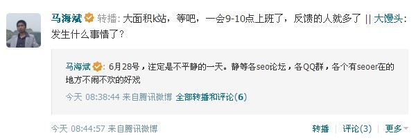 到了8点多,我就在几个长混的QQ群和肤浅单薄http://www.zhuojie.net/?/yumaoge上发了年夜体以下意思【6月28号,注定是不舒适的一天。静等各seo论坛,各QQ群,各个有seoer在的处所不闹不欢的好戏】。