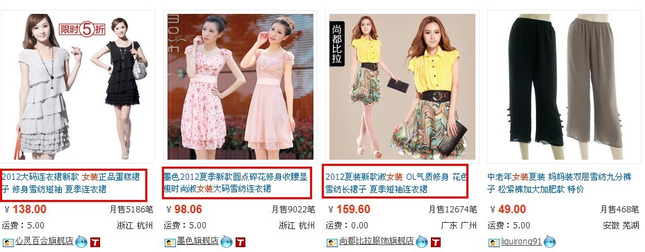 然后我们看实例:以“女装”为例,搜索女装的时辰,巨匠先关注2个处所: