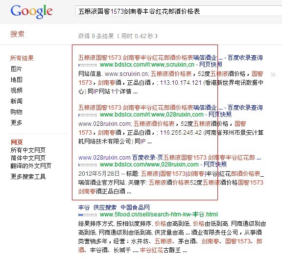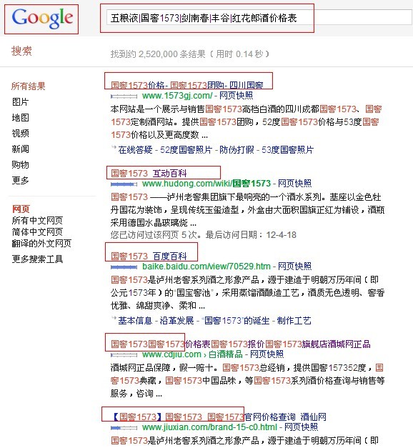 迷惑:为什么只是看到了国窖1573呢?莫非排在第一位的五粮液就不是用户想在google搜索的一部门?google还自作主张了呢?确实感受这种搜索很wired。不外当去失踪搜索中的竖杠,google默示得更二。搜索出来的前三个都是统一个垃圾网站,做seo的人很厌恶的一种站点,专门抓别人的快照,收录人家的seo、快照信息的网站。对用户一点儿价值没有的网站,排在了前三位。