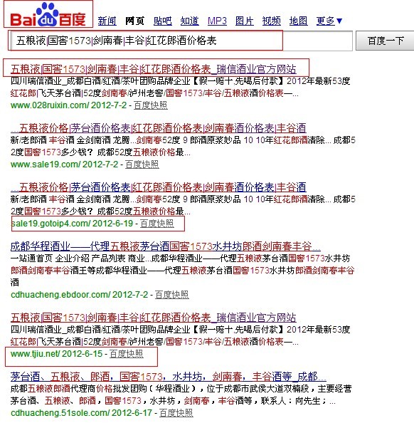 同样的一句话“五粮液|国窖1573|剑南春|丰谷|红花郎酒价钱表”,我在百度搜索发现仍是很好的,能够切确识别竖杠,不影响搜索结不美观,同样去失踪竖杠“|”,百度的搜索结不美观依旧是那样切确,李彦宏开创的中文搜索引擎确实很牛掰。