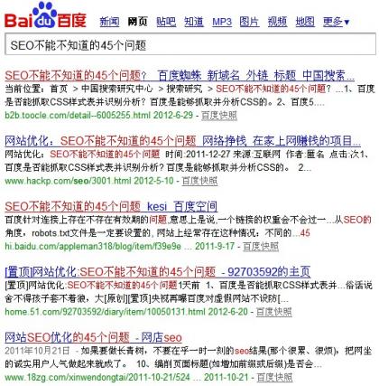 好比,有人将百度站长俱乐部中百度搜索工程师Lee的多个回覆总结成《seo不能不知道的45个问题》一文,转载不竭,这样的转载对于seoER来说,必定比绝年夜年夜都seo博客所谓原创更有价值。