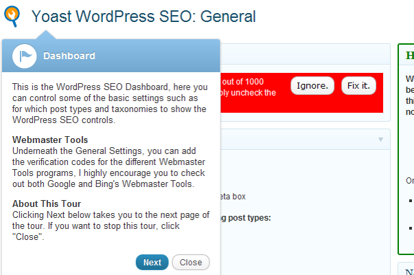 此外Yoast 供给了新用户指导。一旦安装后,在wordpress后台屏幕上就会呈现设置指导,做的很人道化。这个指导教程说了然新用户改若何设置装备摆设以及响应的特色功能。
