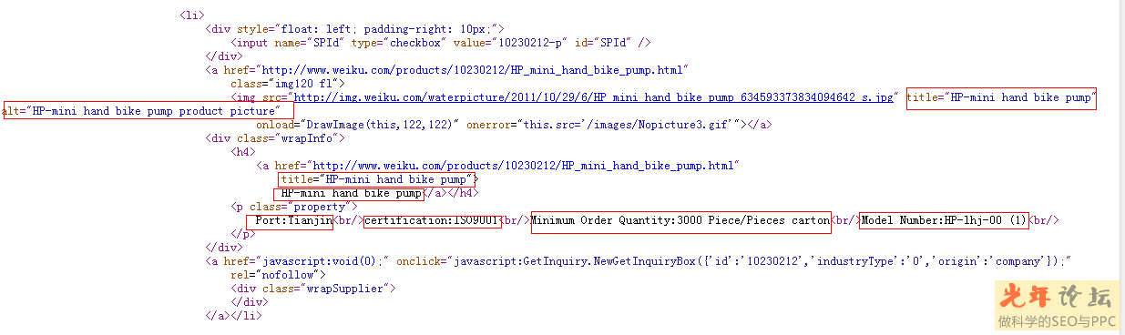 <img src="/userfiles/Auto/20121226" alt="HP-mini hand bike pump product picture" onload="DrawImage(this,122,122)" onerror="this.src='http://www.zhuojie.net/?/images/Nopicture3.gif'"></a> 标签,这是个图片展示标签,该标签也是网站对图片优化的主要部份,因为搜索引擎今朝识别图片的手艺还不强,所以它不能知道图片里是什么内容。而只能经由过程图片四周的文字,img 问题的alt 属性来获取文字判定。所以对图片的优化主若是在 alt属性了图片四周的文字描术上。当然为了考虑图片有时辰下载不了时得用一张默认图片庖代,晋升网站的用户体验。