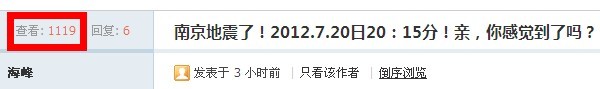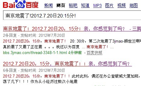 此次的收成就是,在写问题的时辰,必然要把主要的关头词写在前面。我的问题是:“南京地震了!2012.7.20日20:15分!亲,你感受到了吗?”,在百度搜索“2012.7.20南京地震”和“南京地震2012.7.20”都排在我仿造的帖子的前面,他的问题是:“2012.7.20日20:15分,南京地震了!!亲,你感受到了吗?”