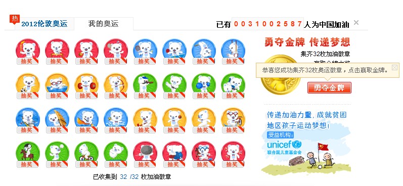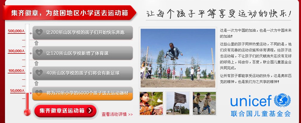 而在最后百度还出动爱心传递,与连系国儿童基金汇合作。只需用户集齐所有的加油徽章,百度便给贫困地域小学送上与运行相关的仪器礼物,让更多的小孩子享受行为之欢愉。然而,就年夜这一点上看,百度的运营筹谋方案做得很高明。事实下场对于一个用户而言,仅仅是为了中国奥运健儿加油,也就可觉得其集齐所有的加油徽章了,抽奖相信更多的是抱着无所谓的心态,可这爱心的传递确实很致命的原因。
