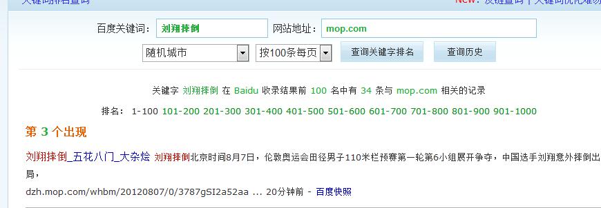 更让人惊奇的是,“刘翔摔倒”这个长尾词百度搜索结不美观前一百名中有34个来自猫扑的页面。