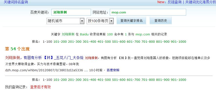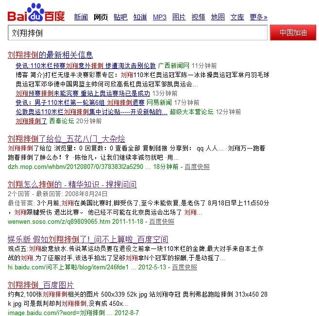 伦敦奥运会刘翔在第一个栏摔倒,无缘决赛,忙的不止是群情纷纷的我们,猫扑也很忙。年夜角逐刚刚竣事,猫扑不竭有人揭晓帖子,问题——刘翔摔倒了。而百度搜索刘翔摔倒,猫扑的排名也是名列前茅。