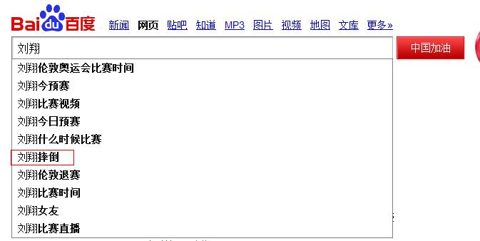 百度下拉无疑是带动用户搜索长尾关头辞书有用手段,当一个事务发生的前几个小时,百度下拉并不会呈现实时的纺暌钩,然而,当事务发生一天摆布的时刻,百度下拉就会呈现相对于的长尾,好比“刘翔”的百度下拉在事务呈现了10个小时摆布就呈现了“刘翔摔倒”,如下图:
