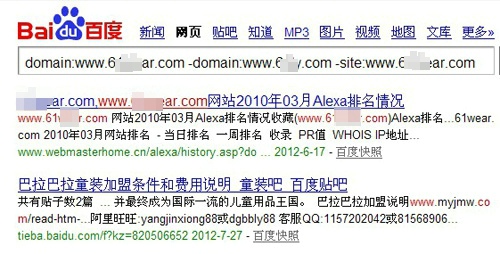 膳缦沔的提到是站长用来发芽、剖析自己网站的外链数目,有时辰我们还有研究竞争对手的网站的一些情形如外链情形,站长也可以在这个指令的基本上巧妙的组合,就可以切确剖析竞争网站的外链数,假如站长要发芽竞争网站的外链数,可是不搜罗他们网站内部链接,而且解除他们外链中链到我们网站的部门页面,再次操作seo组合呼吁发芽“domain:竞争网站域名减号domain:站长网站域名减号site:竞争网站域名”,如下截图。