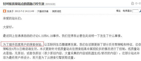 此外,我们会发现搜索引擎算法的每一次更新都以用户为中心,如百度6月份的6.22和6.28事务,有良多站长的网站受到了百度算法此次更新的影响,对此而不满。可是百度官方给出的诠释见下面截图,站长就会年夜白此次更新旨在更好的提高用户体验。