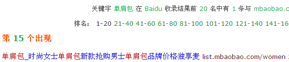 在原文中,提到的还有一句,“同理巨匠还可以选择一个热点分类查看,如“单肩包”也是动态的网址:网址。..。.”看到这里的时辰,既然上文中已经提到了robots.txt屏障簇集的所有页面,那么这里的单肩包相信也是被屏障的,笔者好奇搜索了下单肩包的排名,如图