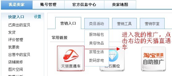 2.进入店肆后台后,点击我是卖家,进入店肆后台后,找到营销中心的我要推广,点击进入。