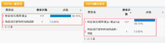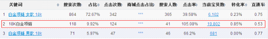 由图上可以看出宝物类目是黄金/黄金,搜索18k白金项链总搜索量是117,宝物类目是项链时,搜索18k白金项链总搜索量是1。