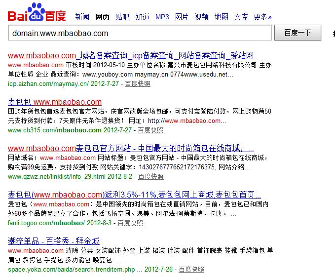 年夜domain语法中,前10页都找不到麦包包的首页,我们一般认为domain中,排名越靠前证实权重越高,而现在麦包包的首页在前10页都找不到,这完全可以说是降权了。