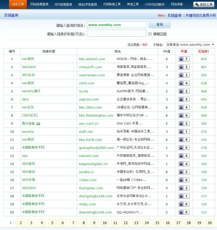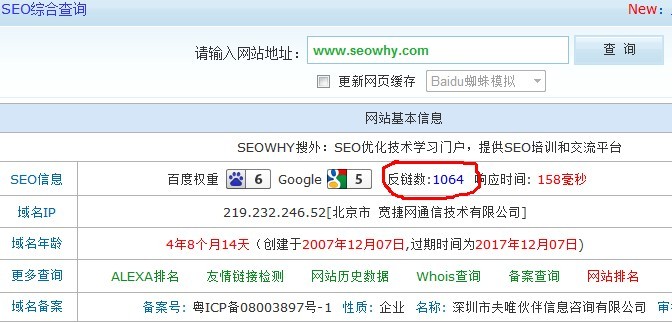 下面是使用站长工具发芽功能检测seowhy的seo综合伙料(反链数在我画的小红圈里) 如图: