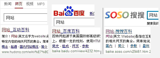 国内有百度百科,搜搜百科,以及互动百科,这三年夜百科分袂对应的是百度搜索,soso,以及刚出来的360搜索,巨匠看如下搜索“网站”关头字的截图对比