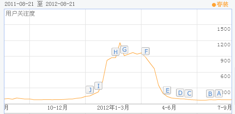 在2012年的一月到三月的搜索是最多的,这就是一个词随时刻转变的具体默示,再如下图的“冬装”指数