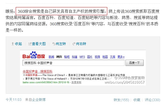 是以,我概略的推理就是,360搜索今朝只有搜索蜘蛛来爬行和抓取网站,并没有专门的预措置、相关排名计较的轨范对收集的数据进行措置,才导致挪用百度、谷歌等搜索结不美观的原因地址,而他们的微博却自称是自立产权的搜索引擎,截图如下。
