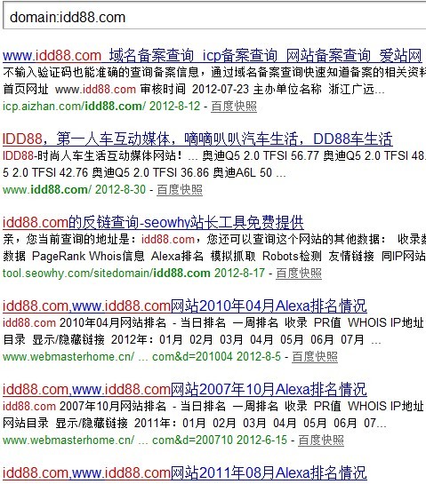 巨匠可以看出,除了百度的快照,就是这个站的排名,这外链做的极差,质量很是的低下,试问若何差劲的外链资本,若何才能晋升你的网站?而且可能其一一个细节巨匠估量么看到,巨匠可以看上图,在domain:的呼吁之下,位你的快照在此外页面之下,这更说了然你的站严重有问题巨匠不信可以试试自己的站,你用domain:呼吁之后,你的快照排在哪?