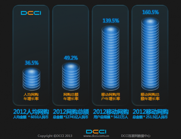 陈述显示,2012年中国网购总额12741亿元,人均网购金额6010元。其中移动网购用户数达5622万人,移动网购总额251.5亿元。