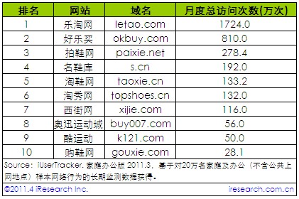 2011年艾瑞数据显示乐淘月度访谒次数为鞋类B2C第一