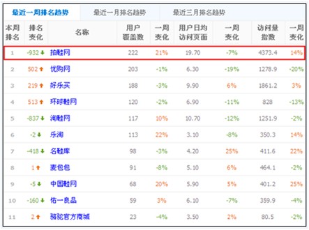 2012年11月拍鞋网以月均220万UV笼盖排名鞋服行业第一位