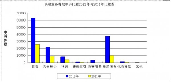 书记显示,2012年,国家邮政局经由过程“12305”邮政行业消费者申诉电话和国家邮政局网站共受理快递营业有用申诉137351件,占全数有用申诉量的98.3%,比2011年增添87886件,增添177.7%;共受理邮政处事有用申诉2396件,占全数有用申诉量的1.7%,比2011年增添973件,增添68.4%。